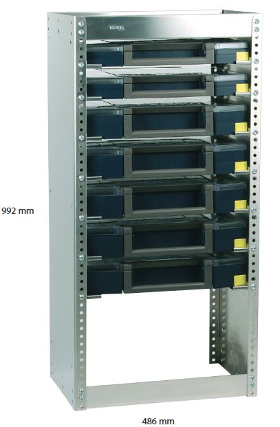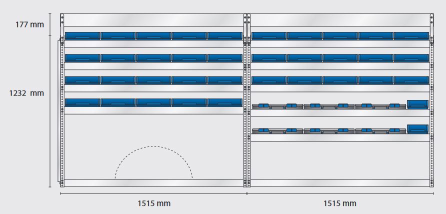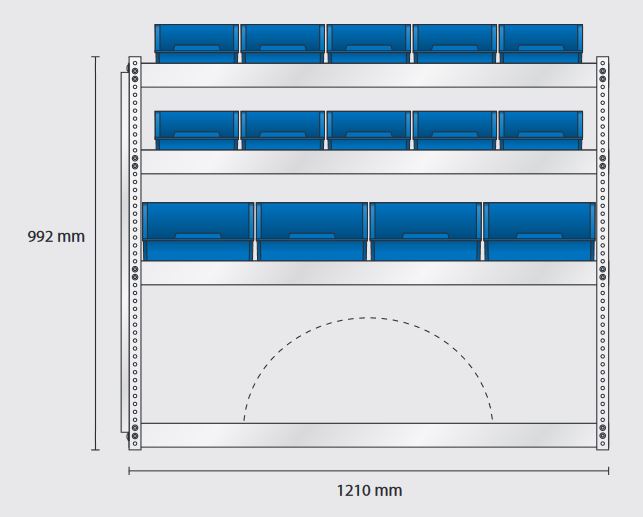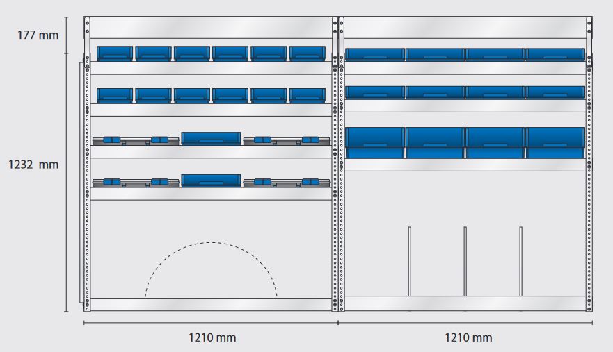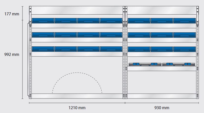 LayoutsThe position of the shelves in the van are marked in grey. All modules are 380mm in depth. The end walls may need to be adjusted. |